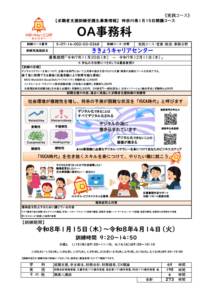 主に雇用保険を受給できない求職者の方(受給が終わった方も含む。)などを対象に、就職に必要な職業スキルや知識を習得するための職業訓練を無料(テキスト代等は自己負担)で実施しています。求職者支援訓練では早期就職することが義務付けられています。